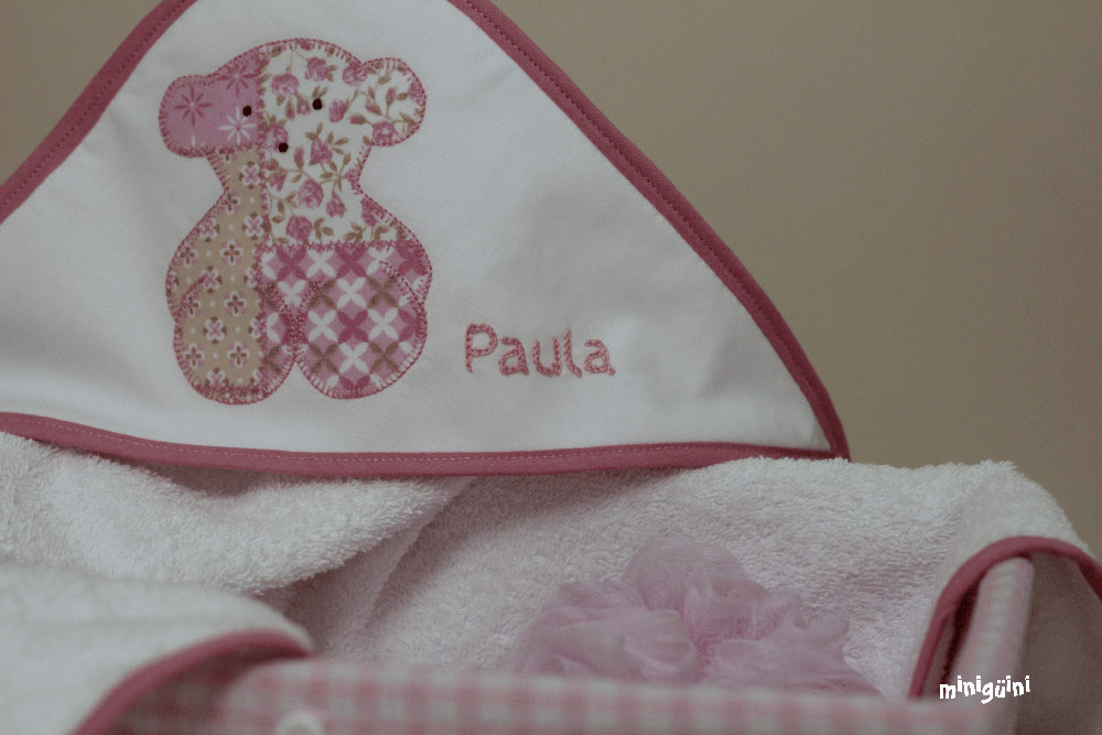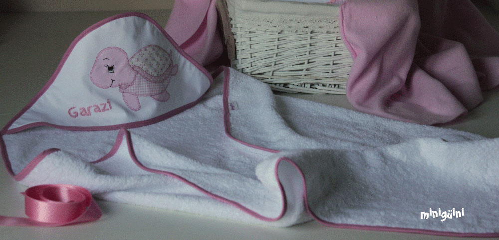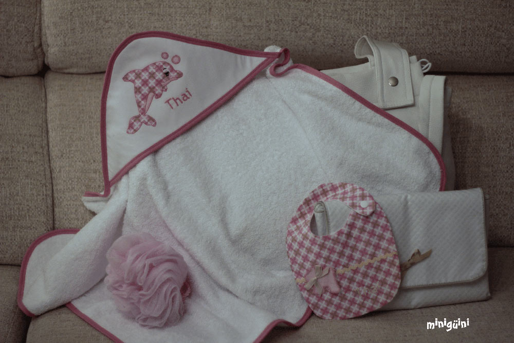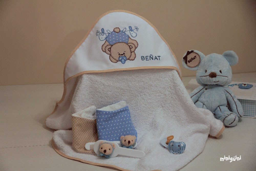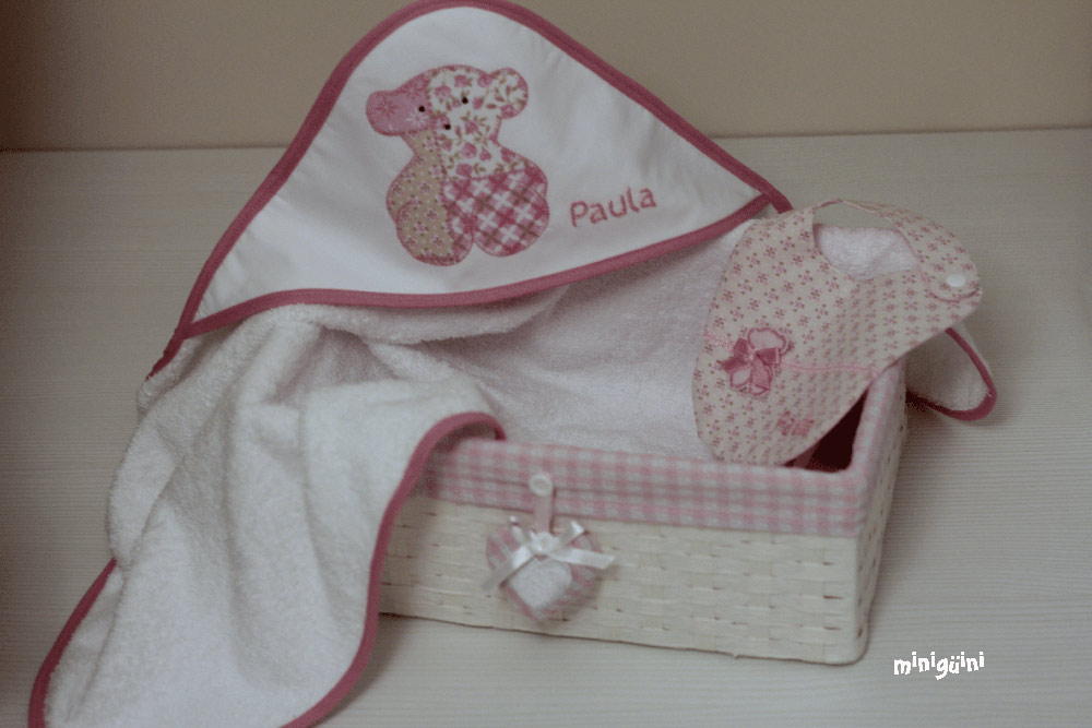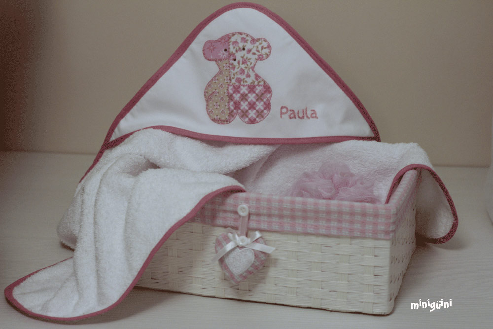 También podemos acompañar la capa de baño con productos para la higiene y utensilios para el baño, haciendo lo que siempre se ha llamado canastilla. Es un buen regalo con el que normalmente se acierta.